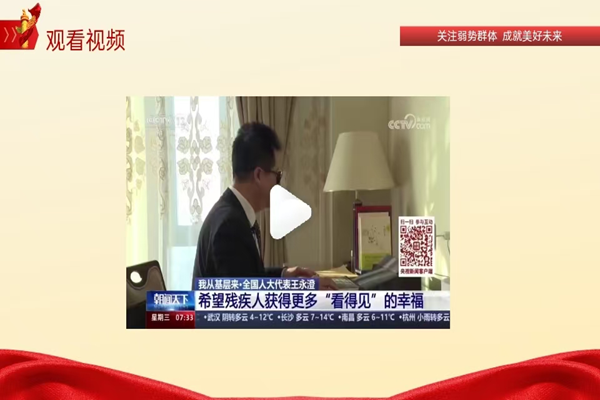 明确学习目的,观看学习视频。主持人带领参会人员一同观看视频《关注弱势群体,成就美好未来》。全国人大代表王永澄提出开设为失能和残疾人群的专业养老院,彰显了他时刻心系群众,致力于为人民群众谋幸福。身为盲人人大代表,他把特殊人群的心声传递到党中央,切实履行好了自身职责。他通过与特殊人群的交谈走访,贯彻群众路线,将人民群众的诉求与国家方针紧密相连。